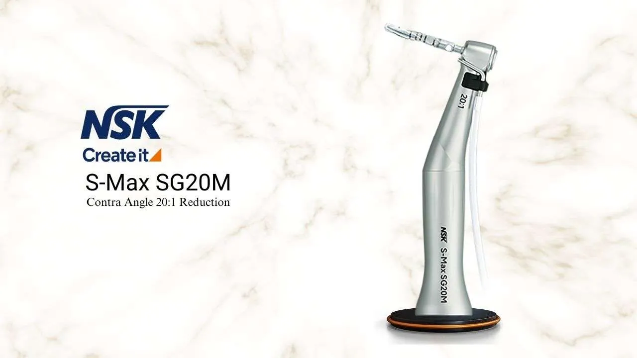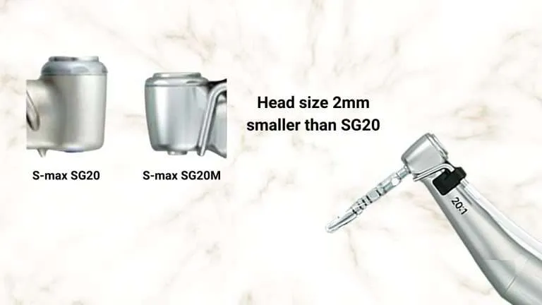 - The NSK S-Max SG20M Surgical Mini Head Handpiece offers precision with its compact 8.6 mm diameter head, making it ideal for tight spaces. Lightweight at 35 grams, it reduces hand fatigue and operates at speeds up to 400,000 RPM with high torque. Features include ceramic ball bearings for durability, a quattro spray system for cooling, and a push-button chuck for easy burr changes. Autoclavable up to 135°C, it meets international standards for reliability and hygiene.